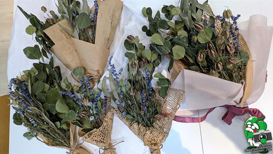 今回はユーカリとラベンダー香るドライフラワーを使って、リラックススワッグを作る内容となり、スワッグをまとめる紐やリボンを参加者が持ち寄っての開催となったんじゃ。