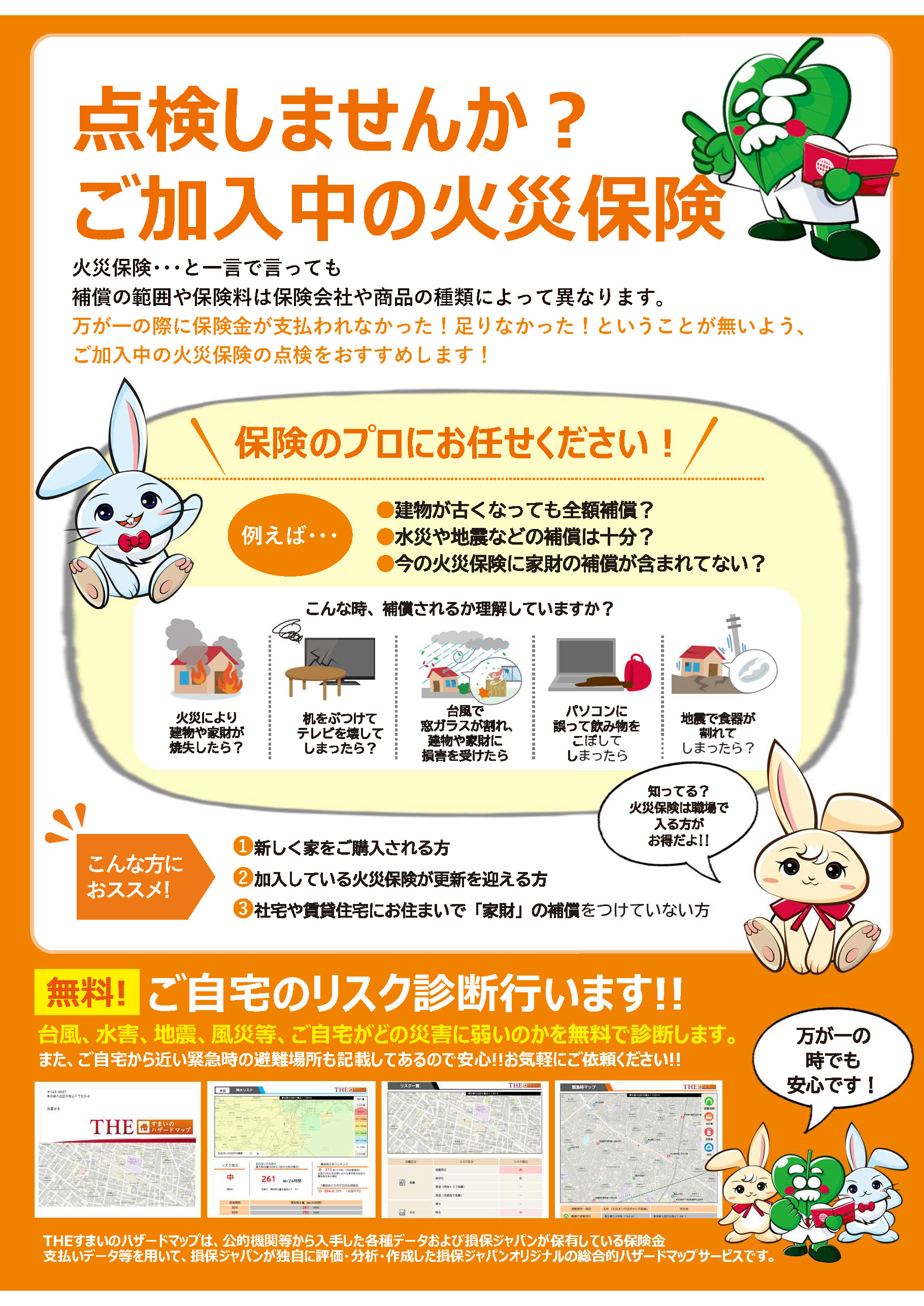 このご案内は個人用火災総合保険の概要を説明したものです。詳しい内容につきましては取扱代理店または引受保険会社までお問い合わせください。