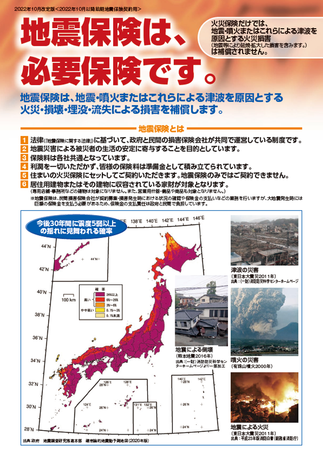 火災保険を契約していても、地震・噴火・津波を原因とする損害は補償対象外です。(火災・損壊・埋没・流失など)別途、地震保険を契約する必要があります。